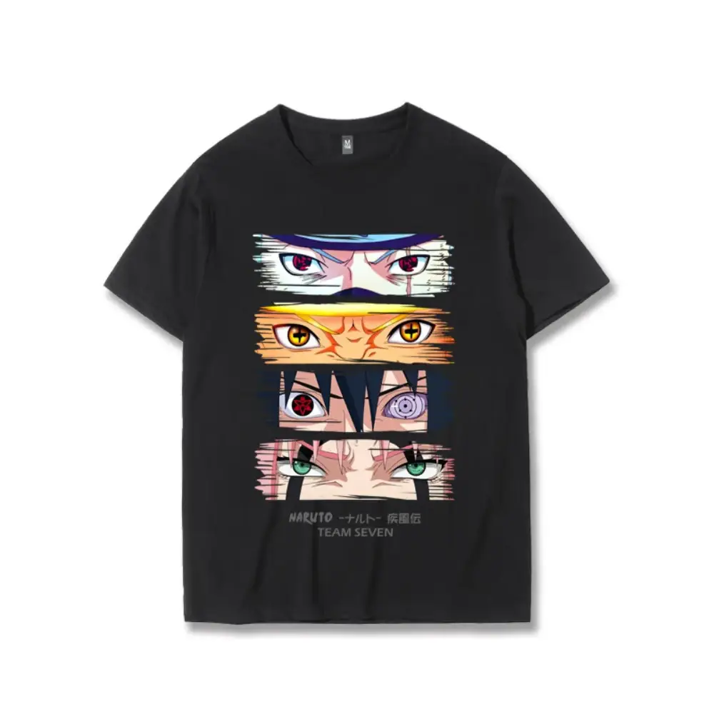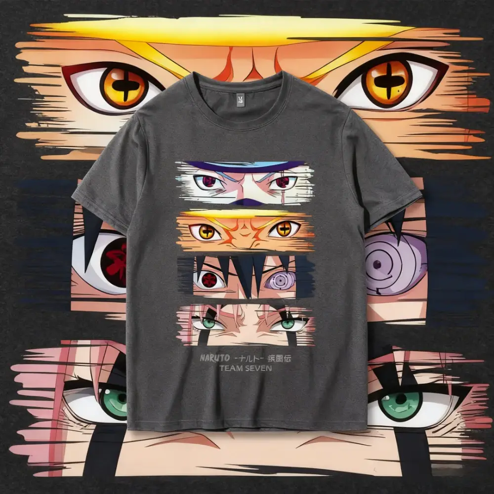 Ce T-shirt gris foncé (Dark Grey) s’intègre parfaitement dans une garde-robe streetwear ou casual. L’impression haute définition des yeux contraste magnifiquement avec le fond sombre, offrant un look à la fois mystérieux et percutant. Le logo officiel “NARUTO -ナルト- 疾風伝” vient signer cette pièce de collection.