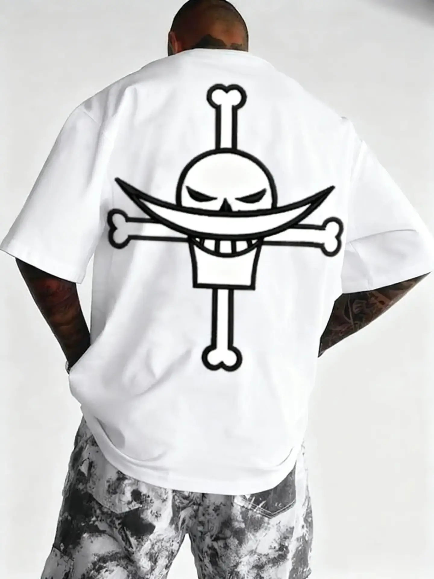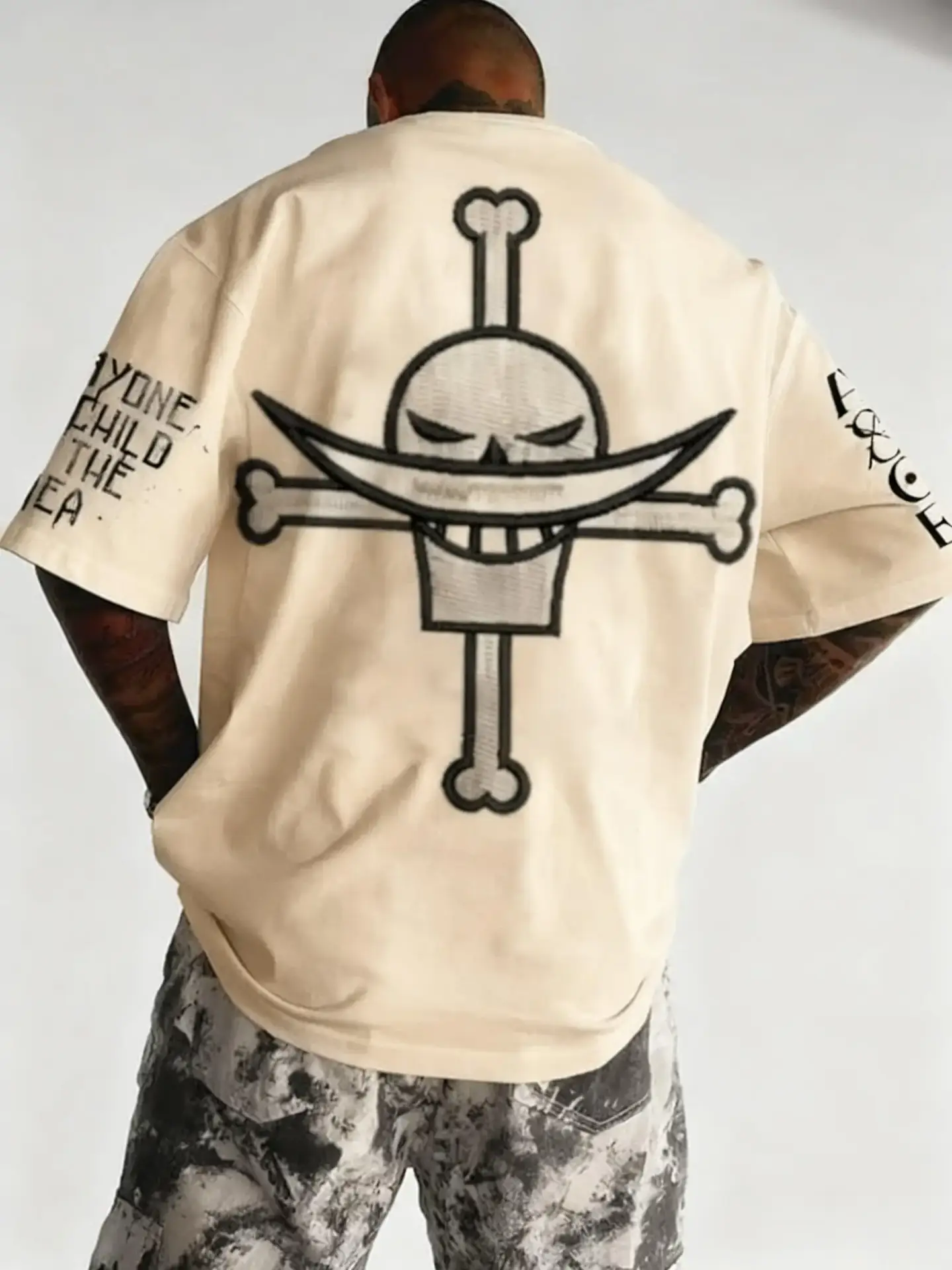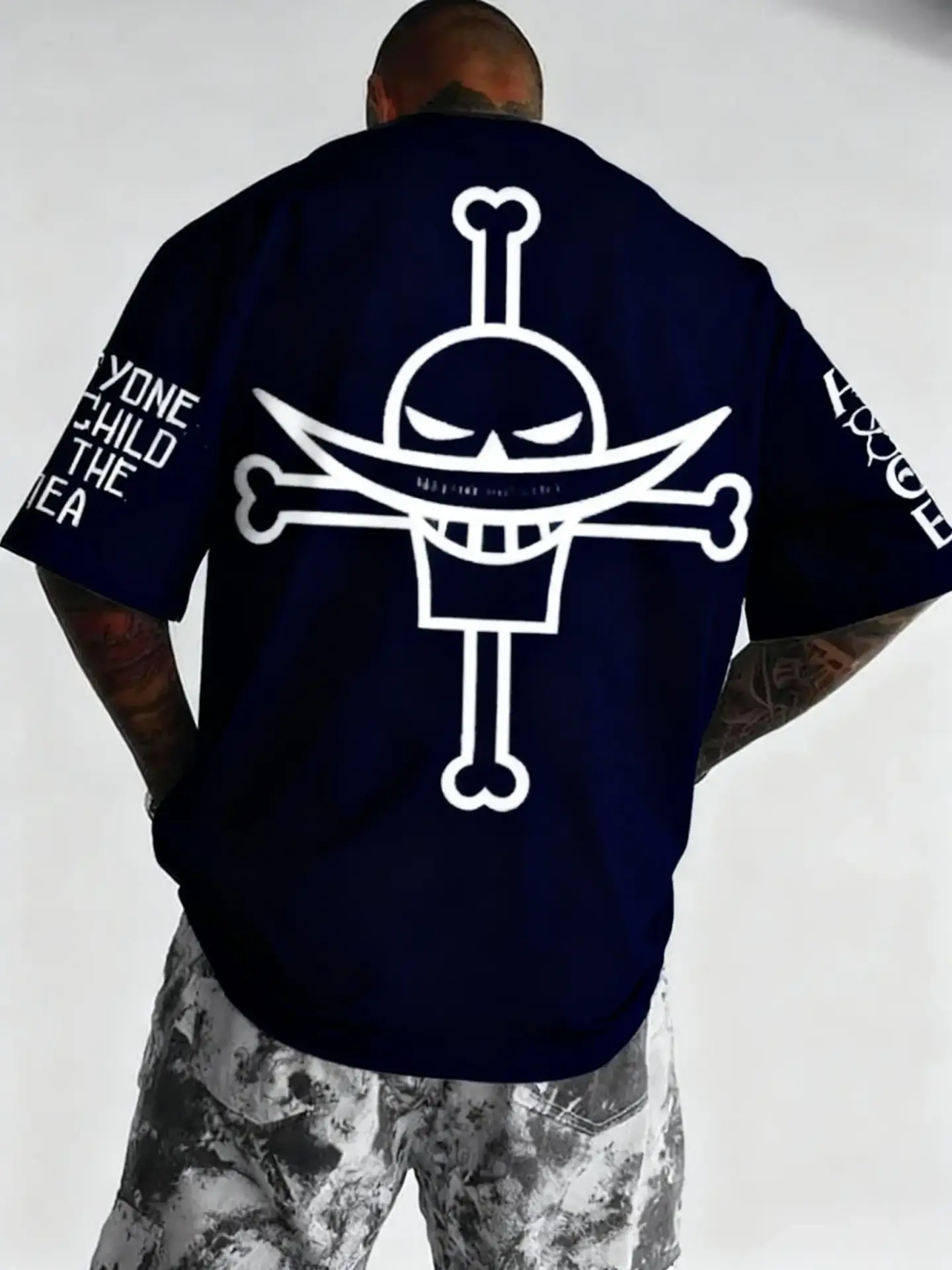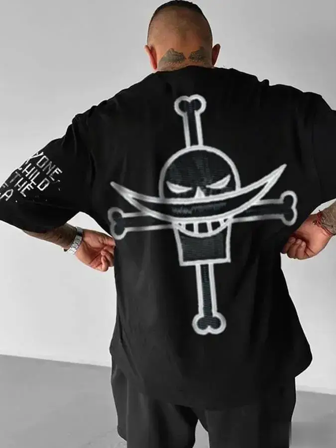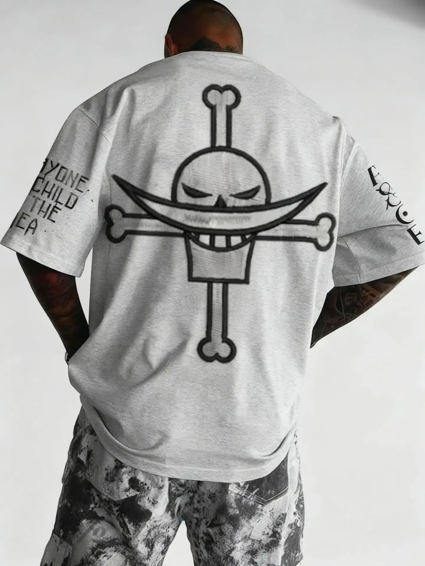 Le dos du t-shirt est dominé par l’imposant Jolly Roger de Barbe Blanche, imprimé en blanc contrastant : le crâne fier avec sa moustache en croissant de lune emblématique et les os croisés. Sur la manche gauche, la citation philosophique de Barbe Blanche, “EVERYONE IS A CHILD OF THE SEA“, est inscrite, rappelant sa vision du monde et de la famille. Le logo “ONE PIECE” est également présent sur l’autre manche.